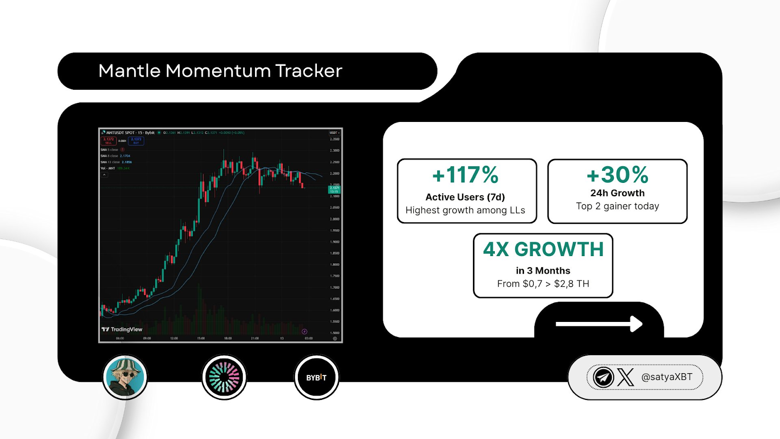 Blockchain araştırmacısı SatyaXBT’ye göre Mantle’ın aktif adresleri haftalık bazda %117 artarak “tüm L2’ler arasında en güçlü büyümeyi” kaydetti.