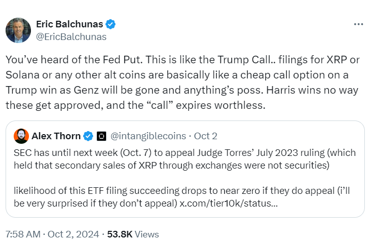 Balchunas, 2 Ekim'de Demokrat aday Kamala Harris'in seçimi kazanması durumunda XRP ETF'nin onaylanma olasılığının “sıfıra yakın” olduğunu söyledi. Öte yandan, kripto para yanlısı Cumhuriyetçi aday Donald Trump'ın zaferi, altcoin ETF'lerine yönelik önemli miktarda daha fazla talep akışı da dahil olmak üzere “her şeyin mümkün olduğu” anlamına geliyor: