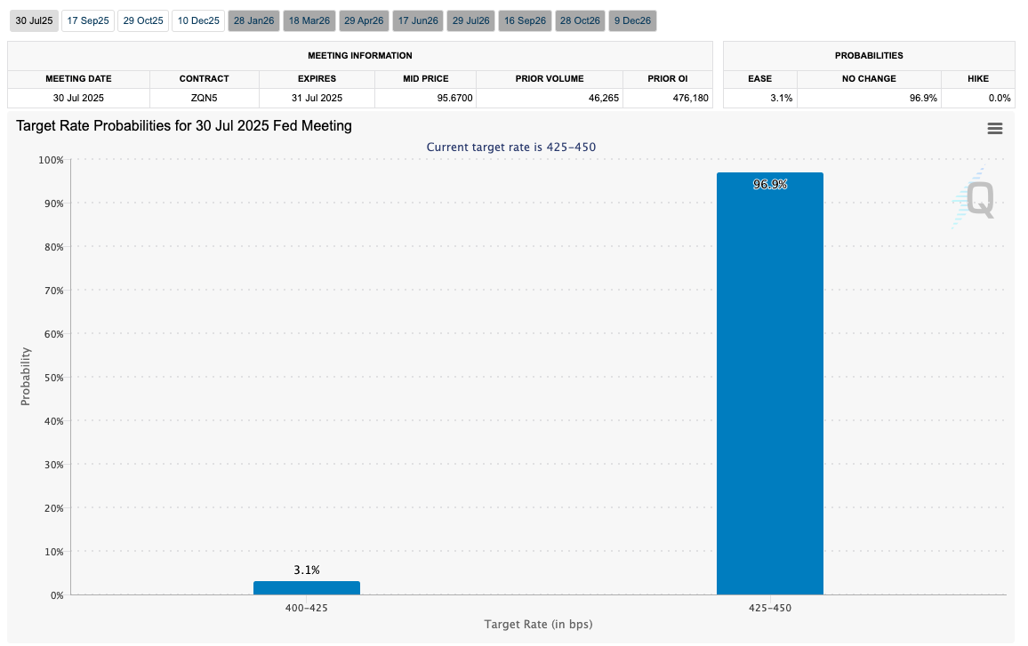 CME Grubu Fedwatch aracından elde edilen verilere göre, piyasalar bu hafta FOMC’den faiz oranlarının azaltılması için faiz olasılığını neredeyse sıfır olarak ve Eylül toplantısının beklentileri güçlü kalıyor.