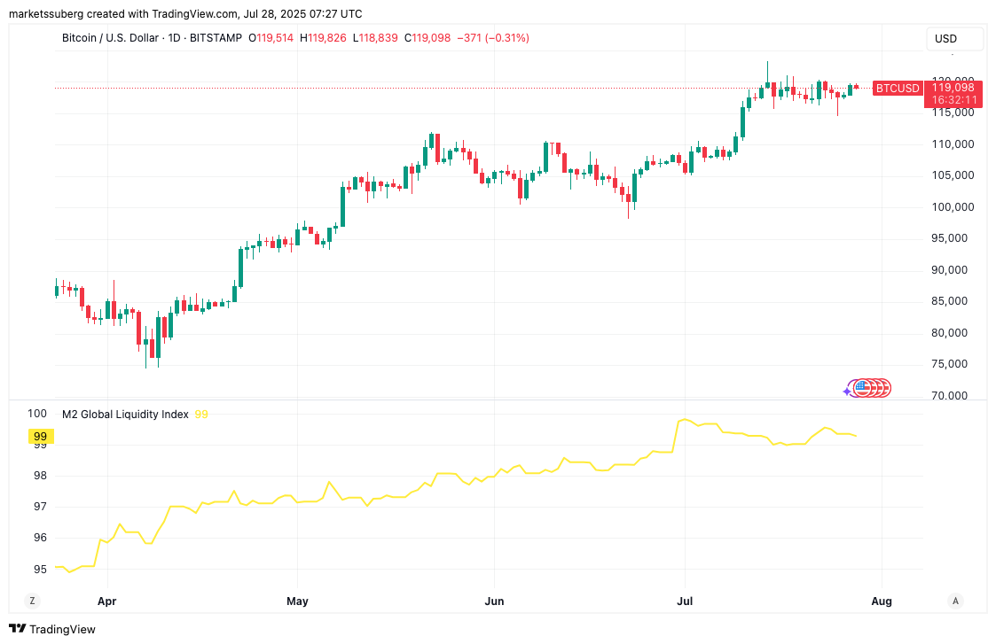 Cotelegraph tarafından daha önce bildirildiği gibi, bitcoin ve kripto performansları tarih boyunca küresel M2 likidite eğilimleriyle yakından bağlantılıdır.