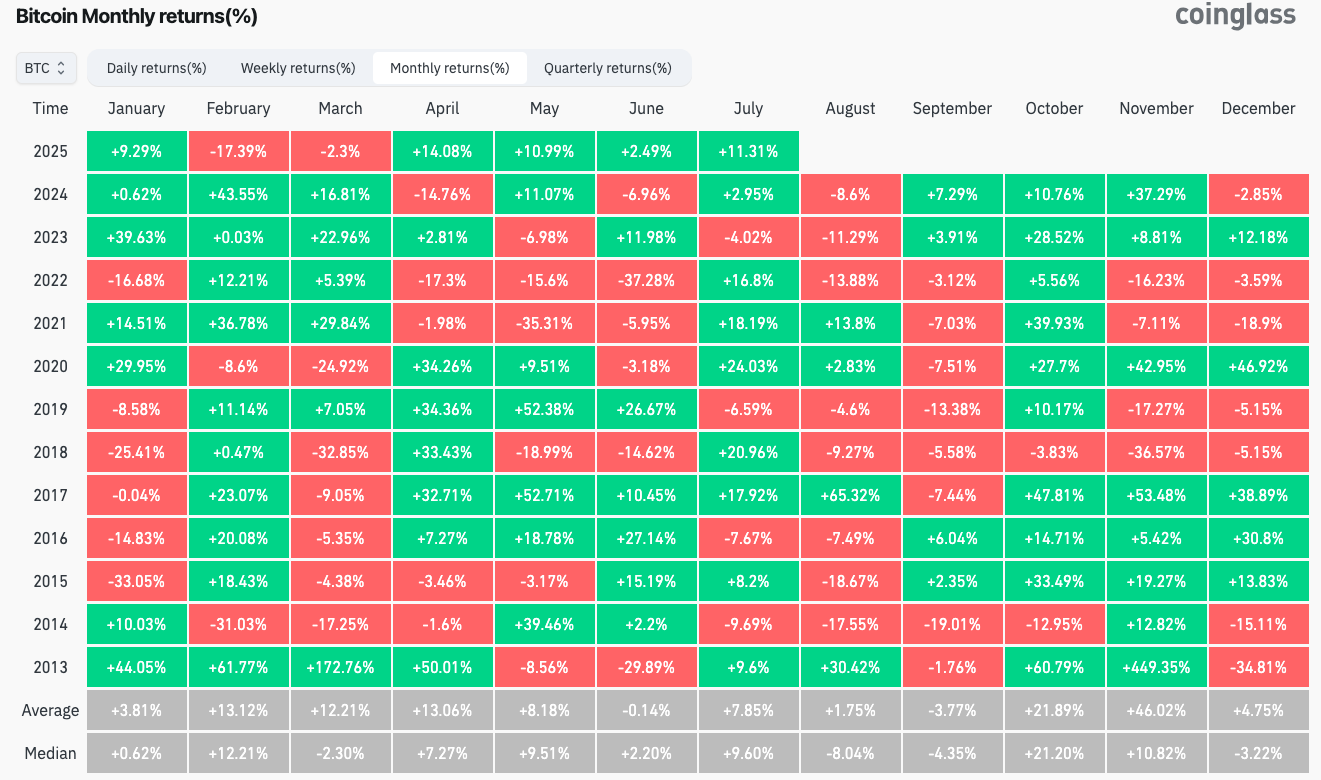 Karşı veriler, BTC/USD’nin Temmuz 2025’te yüzde 11,3 arttığını ve bu oranın son 12 yılın ortalamasının biraz üzerinde olduğunu gösteriyor.