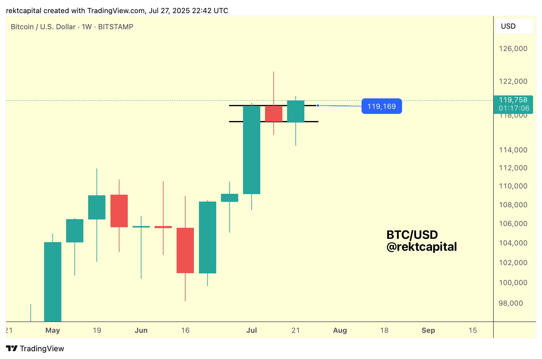 Yatırımcı ve analist Rek Capital, Bitcoin’in haftalık kapanışla 119.450 dolar ile bir boğa Stendardo kurduğunu söyledi.